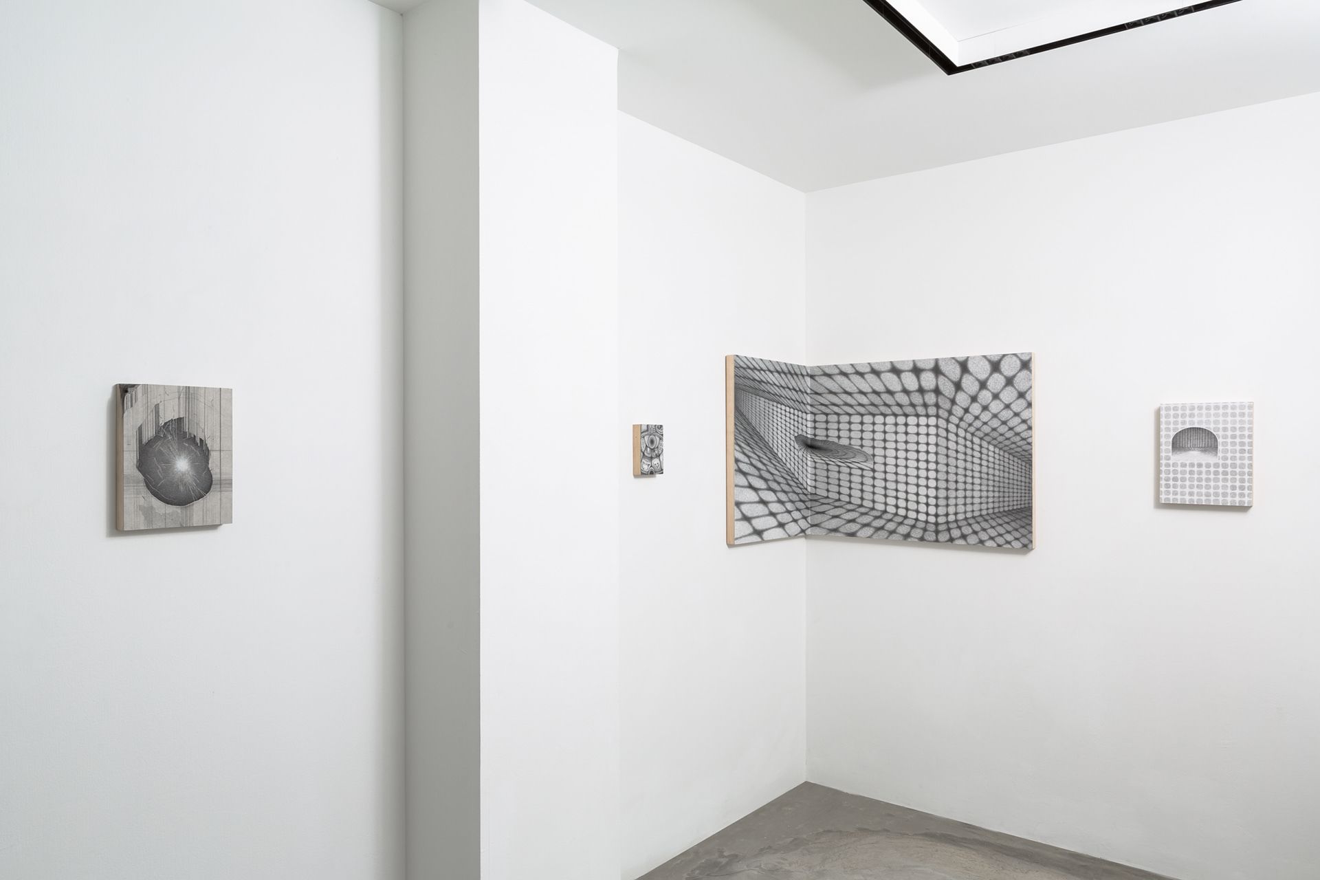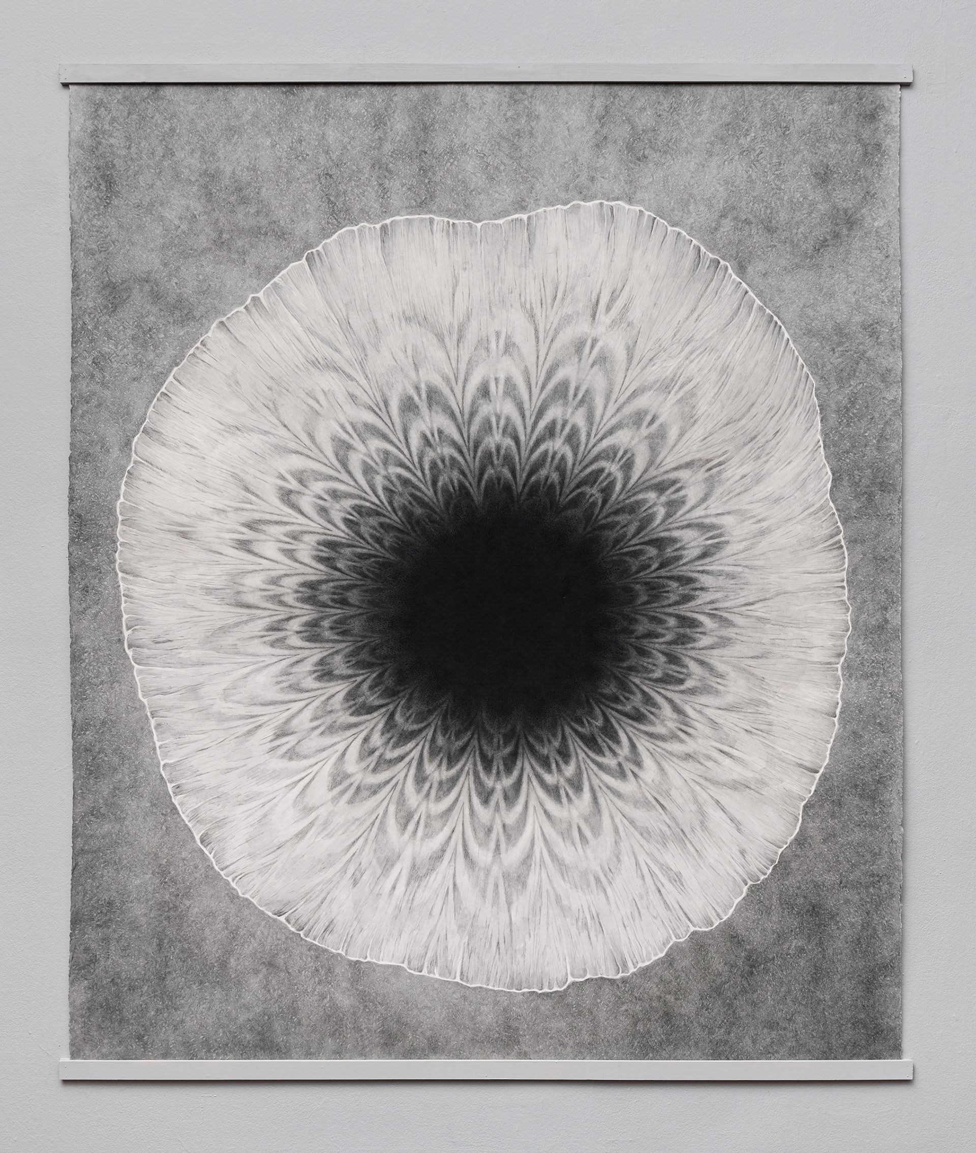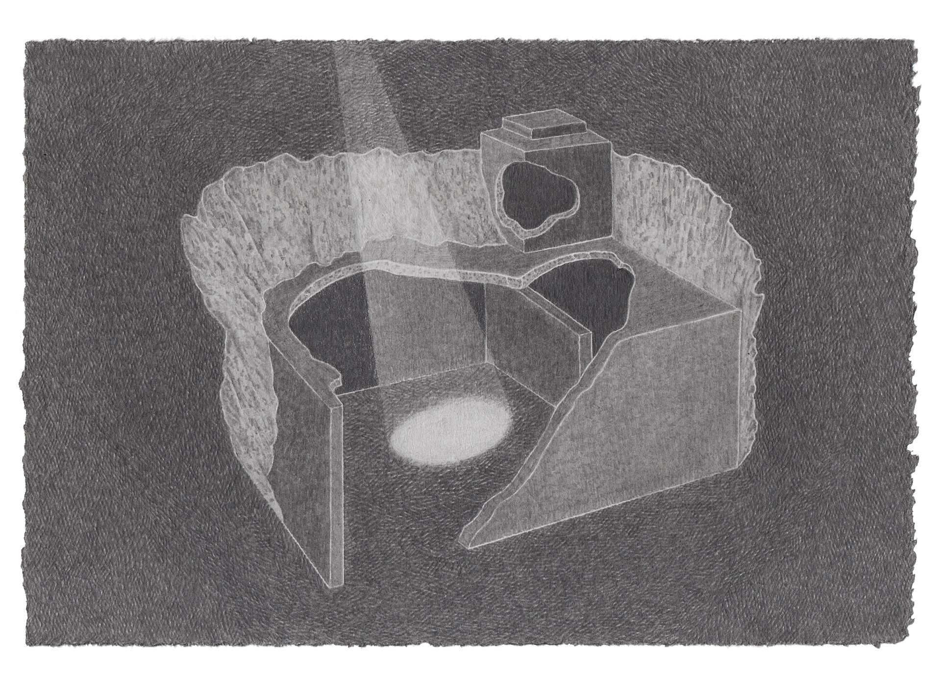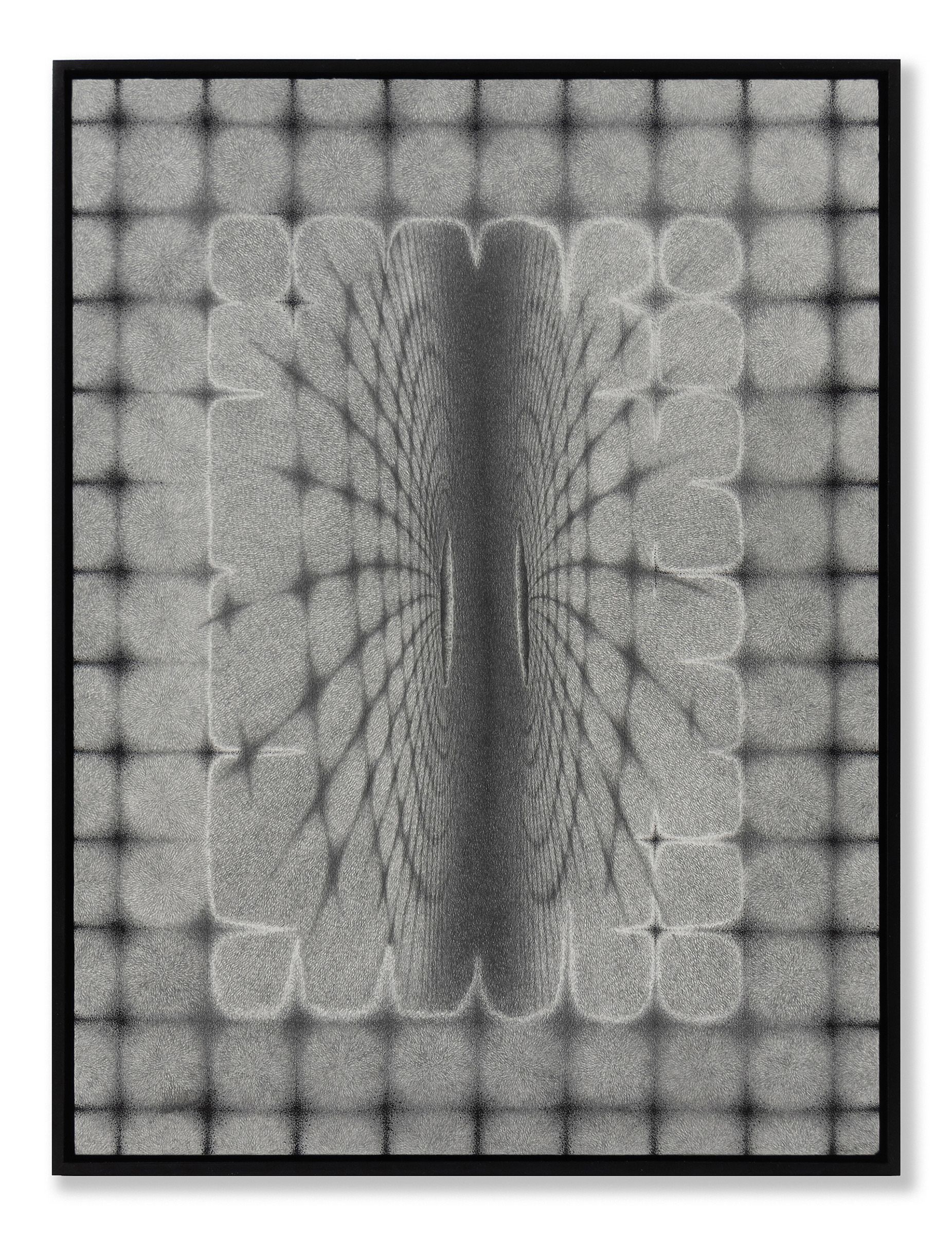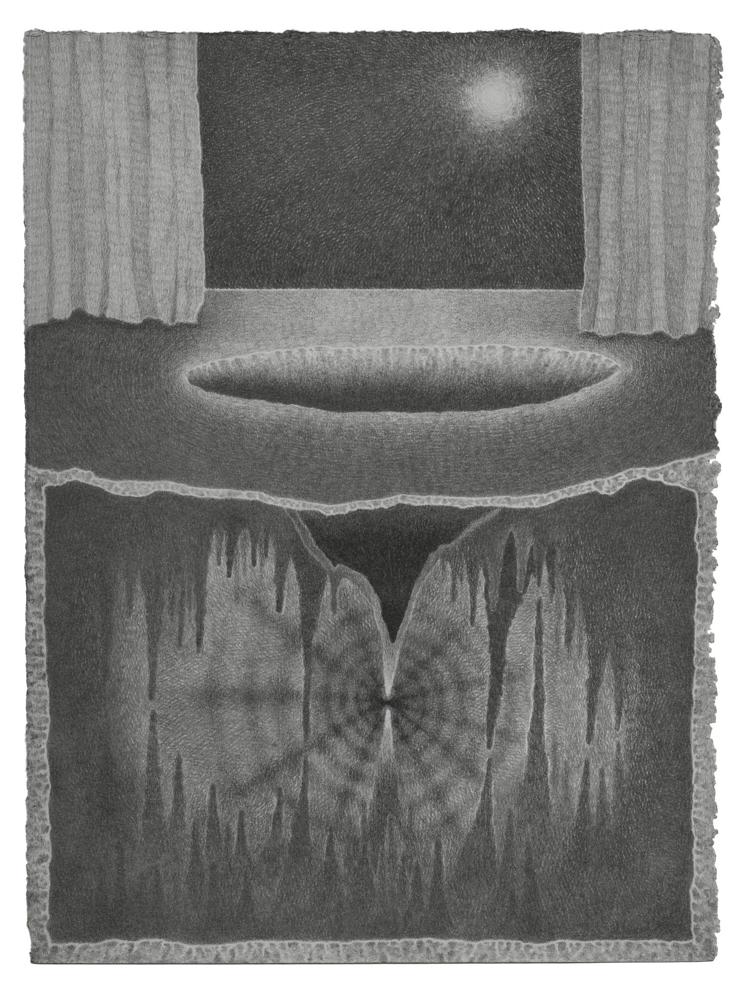I realized that when I began taking drawing seriously, my preferred method of mark making was through cross-hatching. Something about its ability to express a variety of textural shifts and spatial fields really appealed to me. After a long time working with this process, I started to think about how it conceptually operates within the images I create. It seems to shapeshift and take form as both terrestrial and celestial scapes, while also transforming into the digital space of TV static. I love the tension and vibration this creates within an image, and how it can connect all of these ideas of space into a single image. There is something about this “TV static” effect that ultimately takes you into a psychological space.