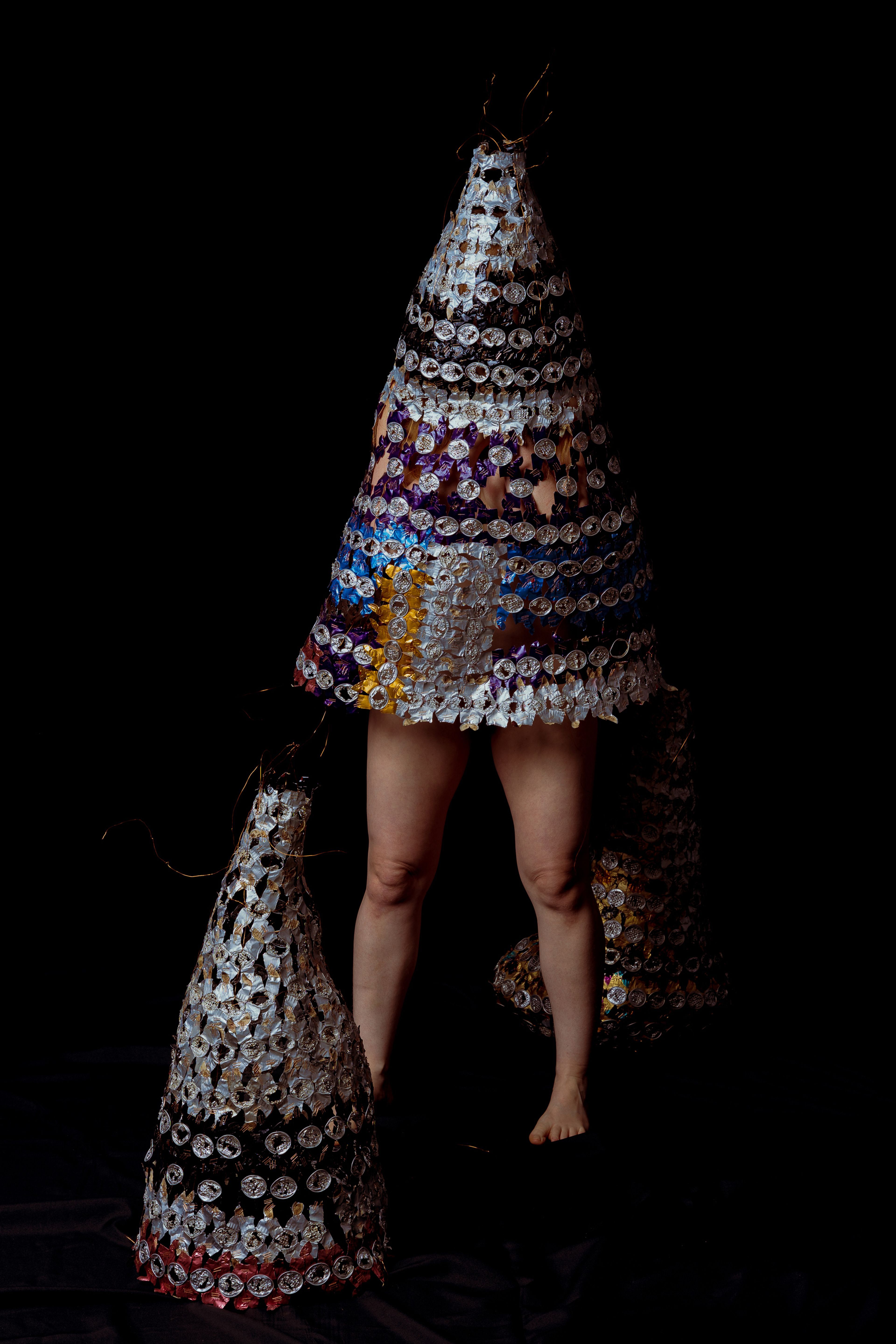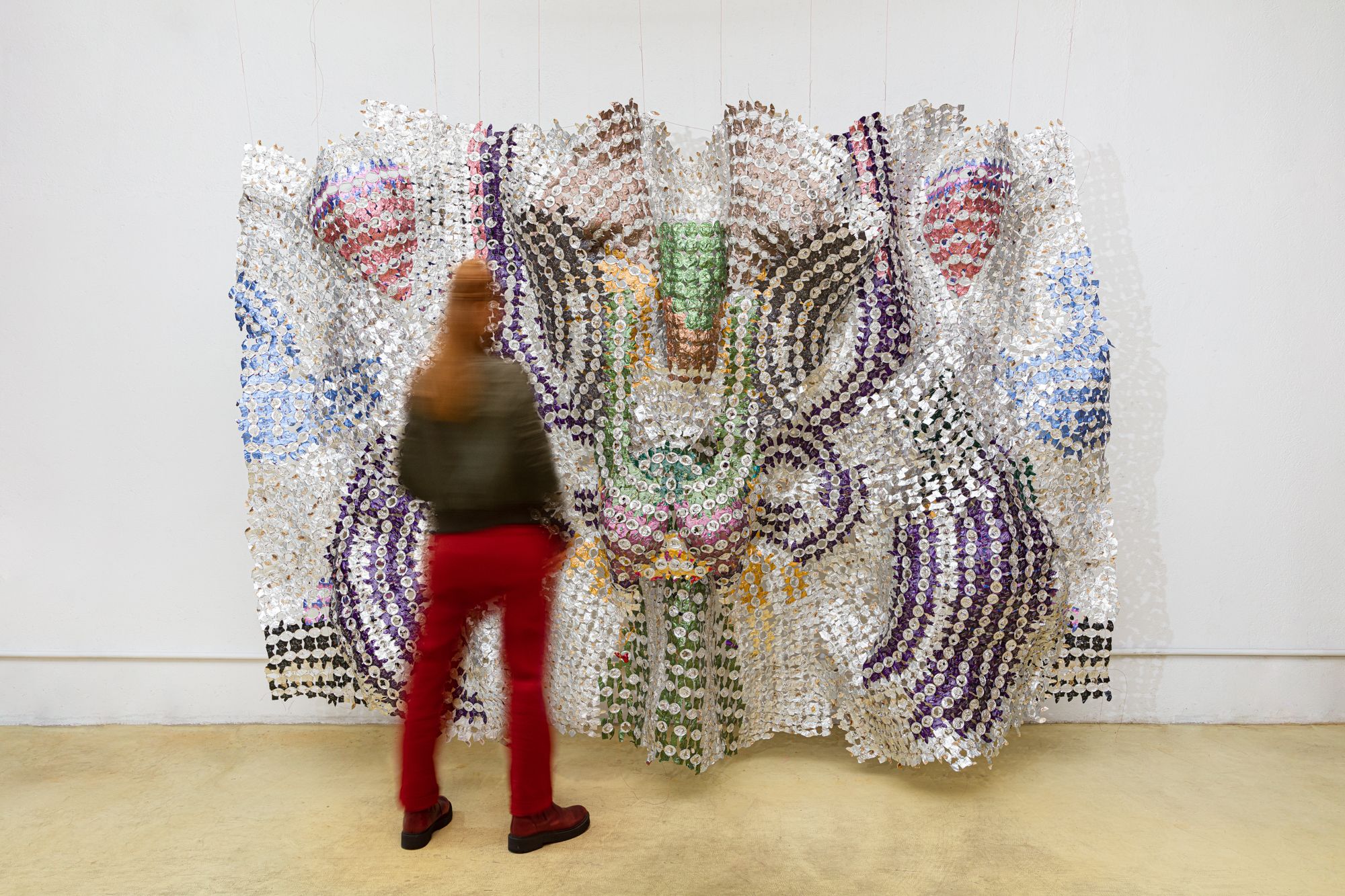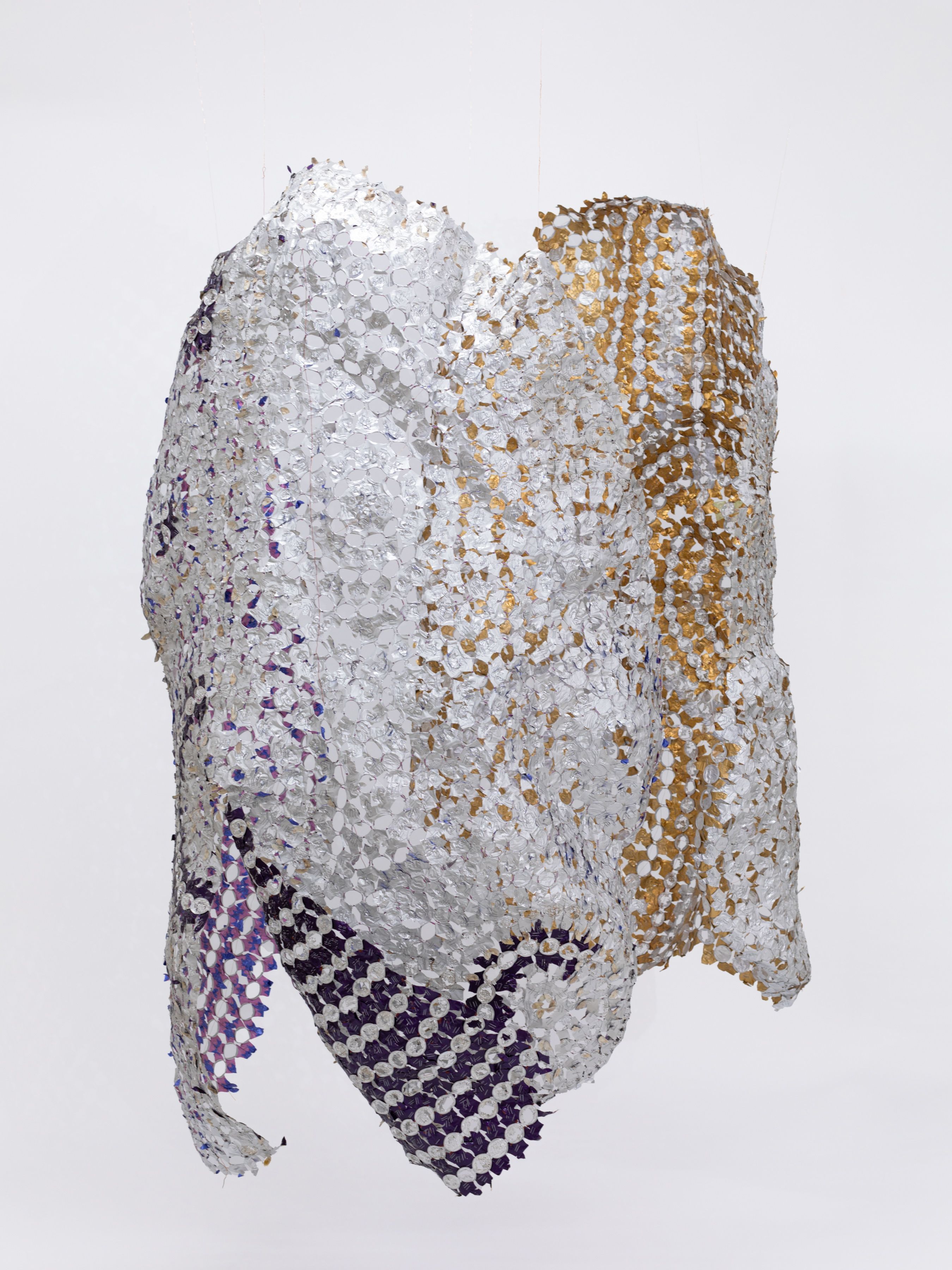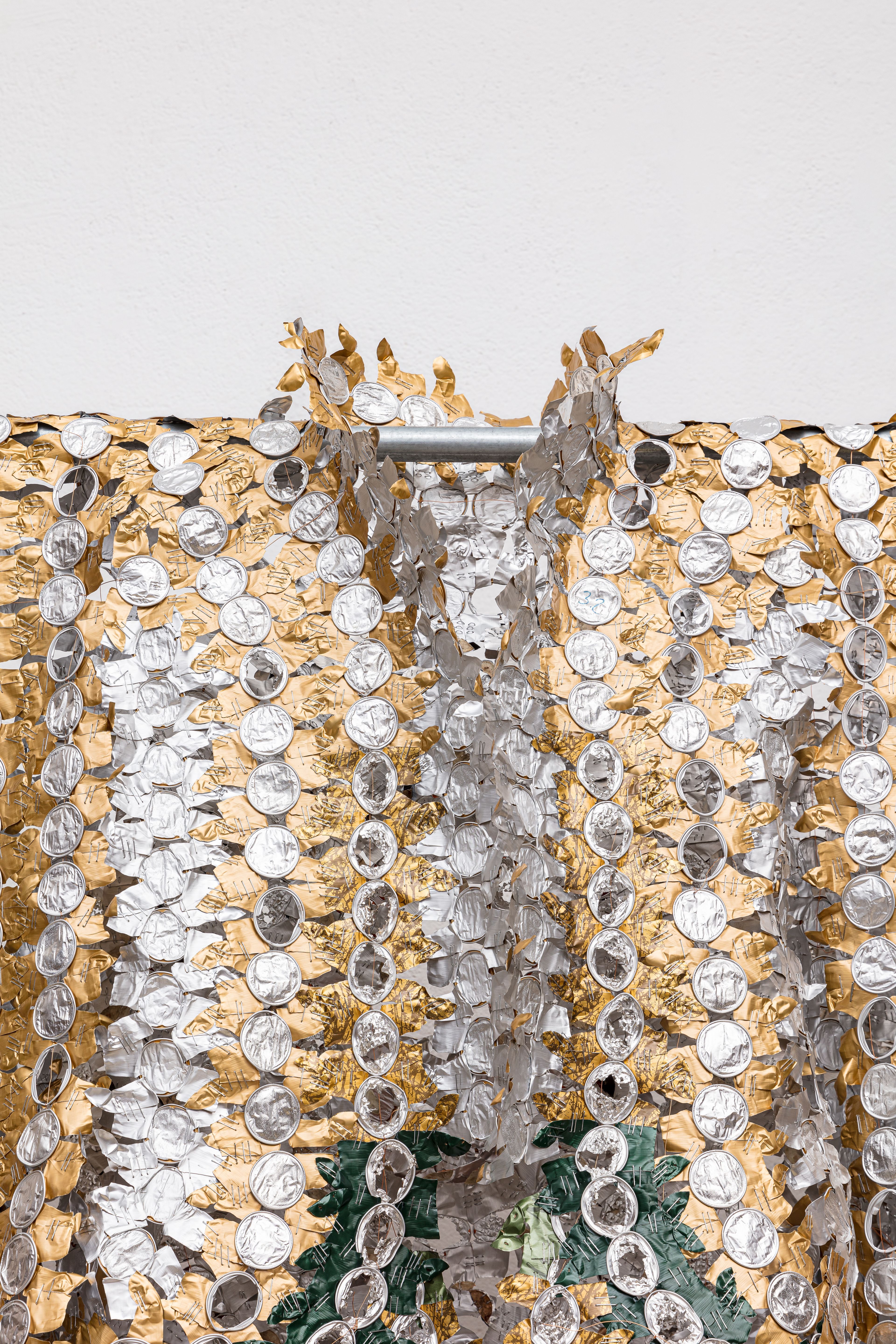 The coffee capsules go through a lengthy process of cutting through the aluminum, removing the used ground, moldy coffee, a first soaking, a process of flattening by hand each of these elements, and finally cleaning them thoroughly by soaking and brushing off most coffee and moldy traces. After this process of cleaning and flattening, these small pods become individually shaped units that, assembled together, become a weft, which in turns acquires textile qualities: it is a ductile material which accepts folds and layers, and behave as textile constructions in space.