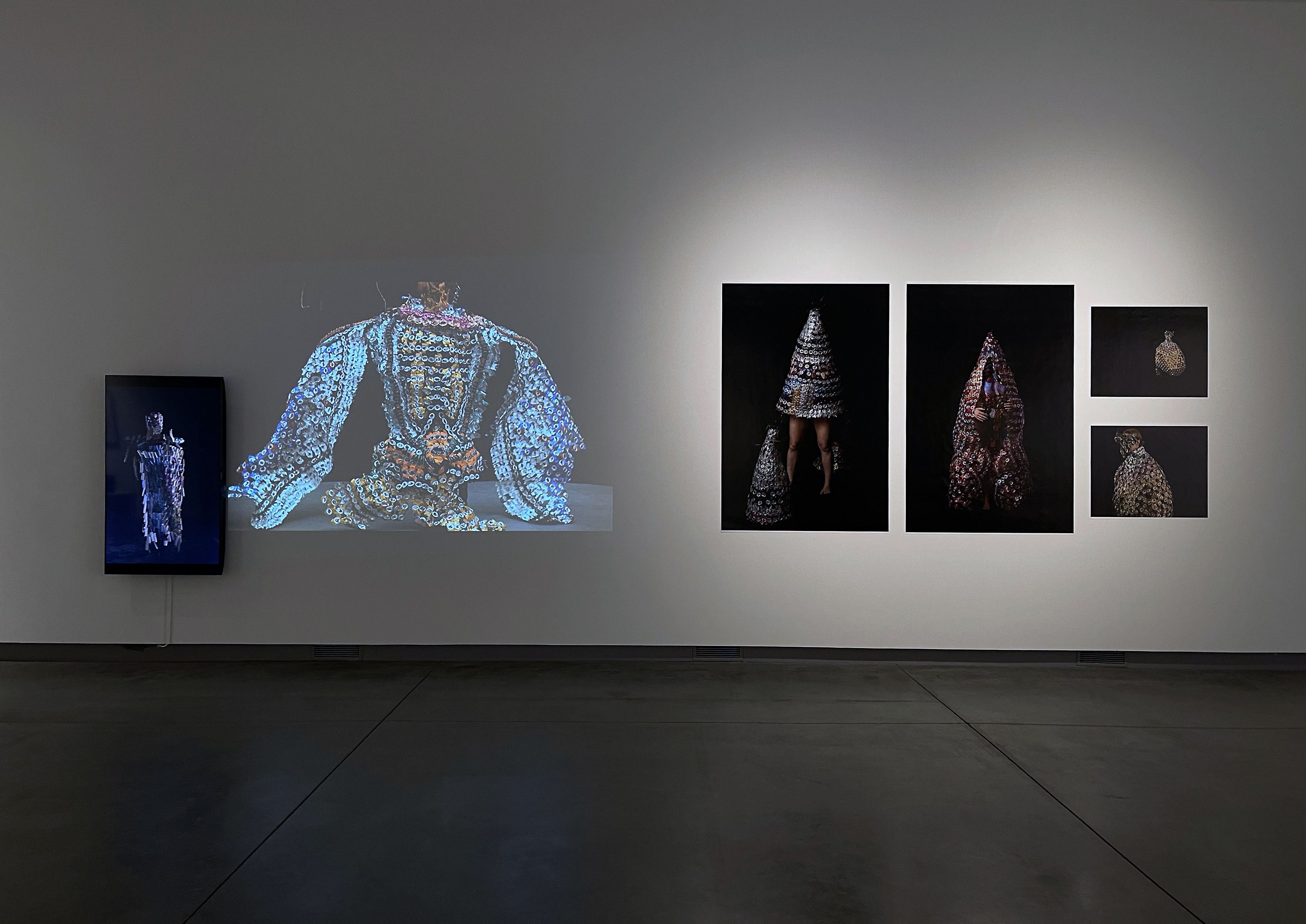 Last year I had a large scale solo show at Fundação Nacional das Artes in São Paulo, and the huge tall ceiling gallery gave me ample opportunity to install all of my biggest pieces and experiment with sound (inferring the inherent possibility of life in the pieces), installation (the pieces were floating lightly in space, away from the walls, some close to the ground, others floating high above the viewer’s head) and video (in which I exemplify what it feels and looks like to wear the pieces). I also wrecked with a critical text that was inserted within the exhibition, as voice over, interspaced with the video pieces and the sound pieces. It was all very sensorial and imbued with darkness and mystery.